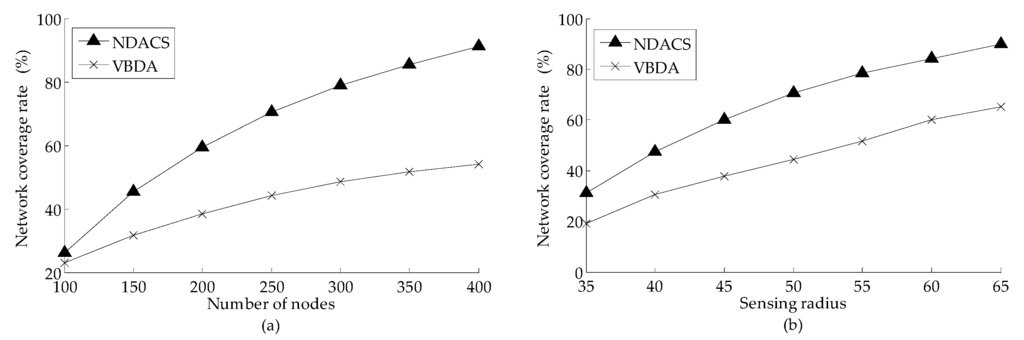 Comparison of network coverage rate between NDACS and VBDA: (a) comparison of network coverage rate between NDACS and VBDA varying with the number of nodes, and node sensing radius is 50 m; (b) comparison of network coverage rate between NDACS and VBDA varying with sensing radius, and the default number of nodes is 200.