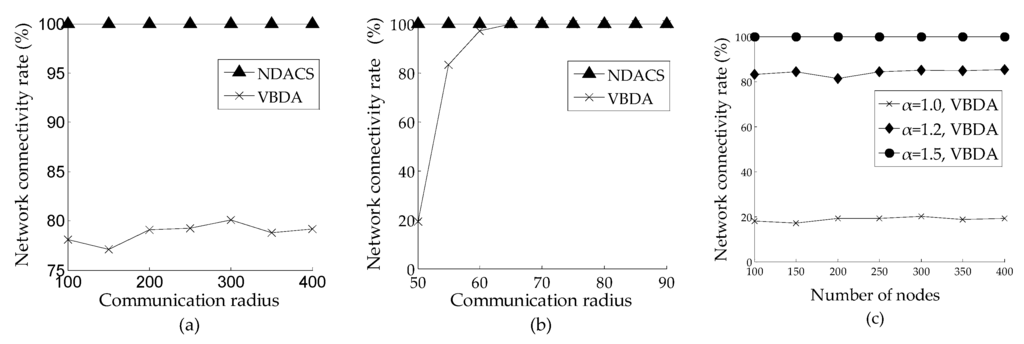 Comparison of network connectivity rate between NDACS and VBDA: (a) comparison of network connectivity rate between NDACS and VBDA varying with number of nodes, and the initial communication radius is 60 m; (b) comparison of network connectivity rate between NDACS and VBDA varying with communication radius, and the default number of nodes is 200; (c) network connectivity rate of VBDA varying with number of nodes on different values of α.
