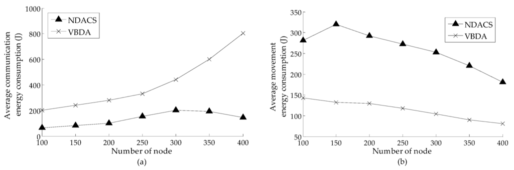Comparison of energy consumption between NDACS and VBDA: (a) comparison of node average energy consumption of communication between NDACS and VBDA varying with the number of nodes, and the initial communication radius is 60 m; (b) comparison of node average energy consumption of movement between NDACS and VBDA varying with the number of nodes.
