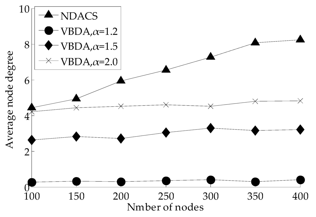 Comparison of average node degree between NDACS and VBDA.