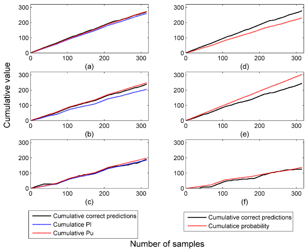 To further investigate the validity of each method, the cumulative probability value/interval was compared with cumulative correct predictions, as shown in Figure 2. We can see that for all three Venn predictors, as the number of predicted samples increase, the cumulative correct predictions kept increasing between cumulative upper bound and cumulative lower bound of probability intervals, with some exceptions caused by statistical fluctuations. This result indicates that the validity of Venn predictors is guaranteed in spite of underlying methods. However, for Platt’s method and Softmax Regression, as the cumulative numbers of predictions increase, the cumulative probability values deviated gradually from cumulative correct predictions. On the whole, the predicted probability values were underestimated by Platt’s method and overestimated by Softmax Regression.