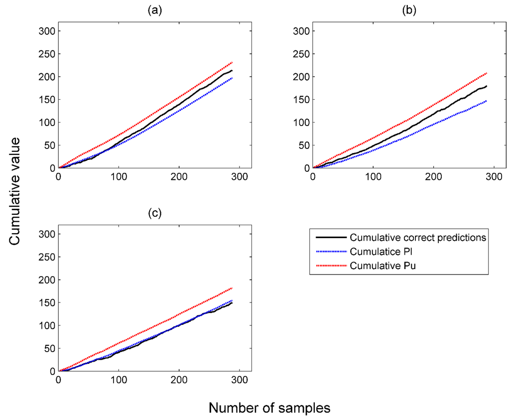 However, for Venn machines, which outputs a probability interval (Pl, Pu) instead of a single probability value, the cumulative number of correct predictions should be between the cumulative lower probability and the cumulative upper probability. This is an overall estimate on the validation of probabilistic prediction methods: