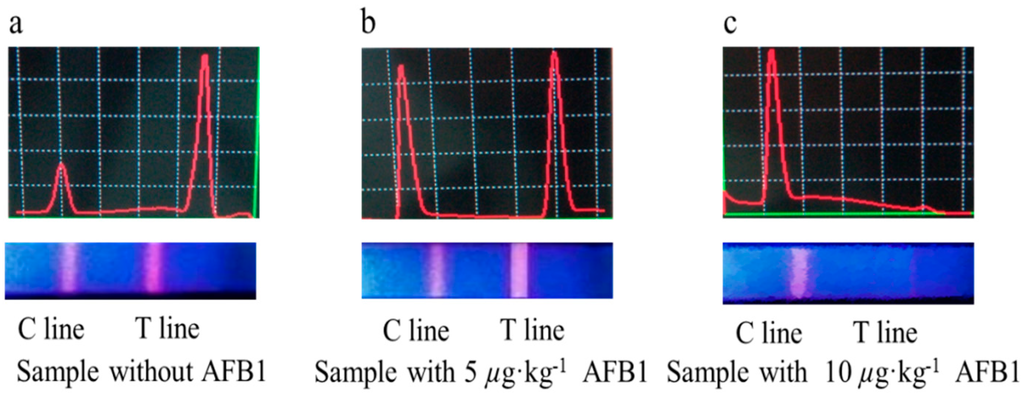 In the positive sample, the AFB1 toxins conjugated with Eu-probe, the compound did not interact with the immobilized AFB2a-BSA on the T line, but reached the C line. The surplus Eu-probe flow was laterally captured by the T line as indicated by a faint red color (i.e., a positive sample with 5 µg·kg−1 AFB1, Figure 2b) or no color (i.e., a positive sample with 10 µg·kg−1 AFB1), as seen in Figure 2b,c.