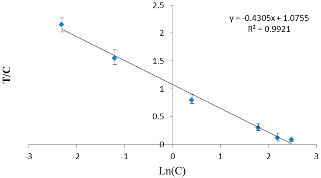 AFB1-free sample extracts spiked with AFB1 standard solutions of 0.1, 0.3, 1.5, 6.0, 9.0, and 12.0 µg·kg−1, were analyzed with the IC strip test to estimate the sensitivity and linear range of the method, respectively. The fluorescent intensities from the T and C lines were recorded as (T) and (C), respectively, using portable TRFIA. The ratio of the value (T) to the value (C) was calculated as the signal ratio (Y). A calibration curve was fitted and expressed as Y versus the natural log of the AFB1 concentration (CAFB1) [27]: