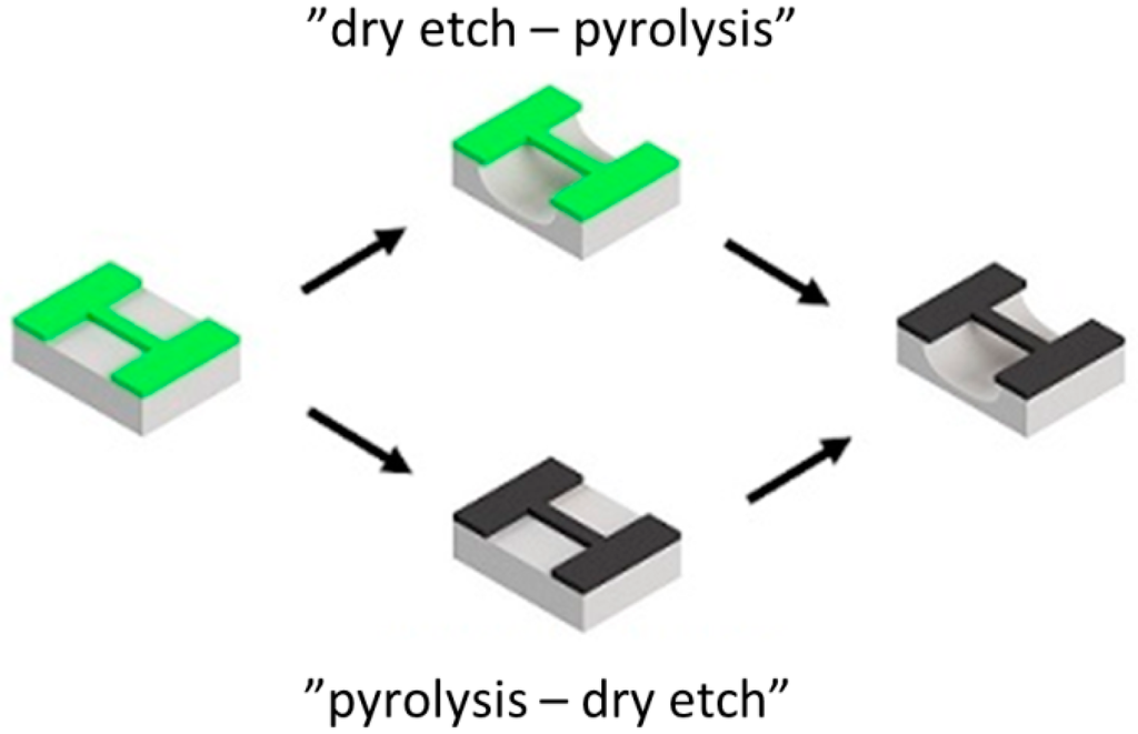 3.1. Fabrication with “Dry Etch-Pyrolysis” Process