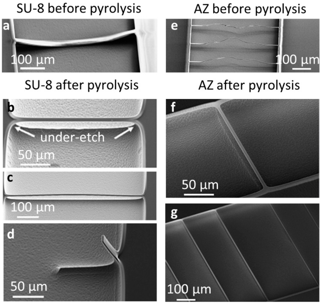 - Singh, A.; Jayaram, J.; Madou, M.; Akbar, S. Pyrolysis of Negative Photoresists to Fabricate Carbon Structures for Microelectromechanical Systems and Electrochemical Applications. J. Electrochem. Soc. 2002, 149, 78–83. [Google Scholar] [CrossRef]