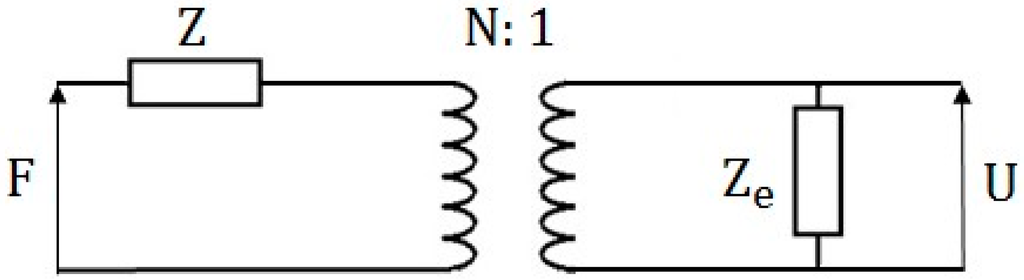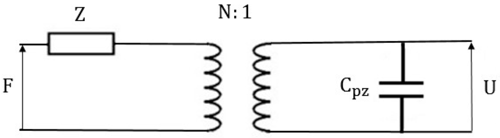 The equivalent circuit of piezoelectric generators, which expresses both mechanical and electrical parts, is depicted in Figure 1 [46]. At input of this circuitry, external excitation force F is applied. The mechanical branch has one resonant impedance element (Z), which is dependent on stiffness of mechanical resonator and mechanical branch mass. The transformation ratio is equal to N = Cpzh33, where Cpz is the clamped capacitance of piezoelectric material mainly measured when piezoelectric layer is not deformed and h33 is the ratio between piezoelectric coefficient and mechanical compliance. On the right side, the transformer and clamped capacitance illustrate power conversion in energy harvesters with U (voltage) presented as output [47].