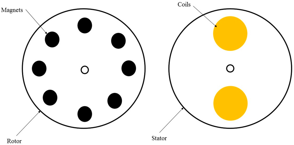 The interaction between wind flow and moveable part of an electromagnetic energy harvester can provide relative motion, which is bound to produce electrical power. Based on the flux density change in proportion to the conductor location change, several wind flow energy harvesters have been devised. Weimer et al. [53] proposed a circular electromagnetic wind energy harvester for the axial-flux alternator, where the rotor included 8 neodymium magnets in an alternating pole configuration (as shown in Figure 3) and the stator was manufactured with two separate copper wire coils with 1250 turns. The diameter of the stator and rotor plates is 76.2 mm. The wind flow can rotate the rotor plate, which induces electrical voltage in copper wires. The maximum harvested electrical power in this study at the highest wind speed (8.94 m/s) is 651 μW.