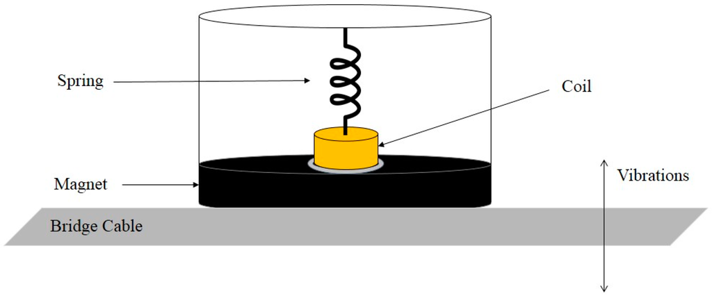 Another configuration that can function well is to use coils as moveable component and consider magnets as the fixed part of electromagnetic generators. Feasibility of an energy harvesting system based on wind-induced vibration of bridge cables was investigated by Jung at al. [55]. In this study, an electromagnetic-based generator was introduced to harvest wind-induced vibration energy due to interaction between wind flow and cables. The proposed device, as depicted in Figure 5, includes a big circular magnet with an opening in the center. The proposed energy harvester has a suspended coil, which is connected to a spring. The ambient vibrations cause oscillation to the coil, which can induce the relative motion inside the magnet. In comparison with the other research work, the proposed device in this study can provide greater magnetic flux due to use of a big magnet compound (enclosing the fixed magnet and moving coil). With 80 mm diameter and 10 mm thickness, the utilized circular magnet could generate magnetic flux density of 0.5 Tesla. The experimental results showed that this device could generate 27.14 mW RMS power at 5.4 m/s wind speed.