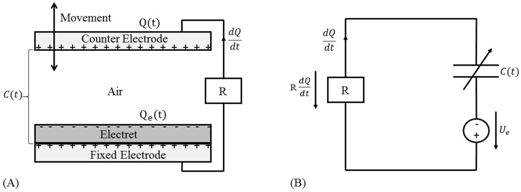(A) Schematic view of the electret-based electrostatic energy harvesters and (B) equivalent circuit.