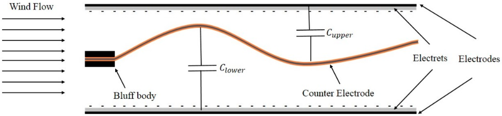 If the prerequisite initial electrical charge for capacitor polarization is realized by the electret materials, promising harvesting performance may be offered by the electret-based electrostatic energy harvesters. Recently Perez et al. [59] introduced a wind energy harvester by deploying the electret-based electrostatic technique. The proposed device in this study includes two parallel copper plates with the size of 50 mm and 200 μm in length and thickness, respectively. Both copper films are covered with a 25 μm Teflon PTFE layer, which was fabricated by corona discharge. Furthermore, a membrane with 25 μm thickness of PVDF, whose two sides were deposited with 10 nm gold layer, is attached to a bluff body. The schematic diagram of this wind energy harvester is illustrated in Figure 7. The proposed system has two capacitors between the membrane and upper electrode () as well as lower electrode (). When wind flow blows the membrane to move upwards and downwards, capacitance of the energy harvester would be changed continuously. When wind flow velocity reaches 10 m/s, the membrane can be oscillated. The average output power during period time T is proportional to the capacitance variation between and , which can be determined by: