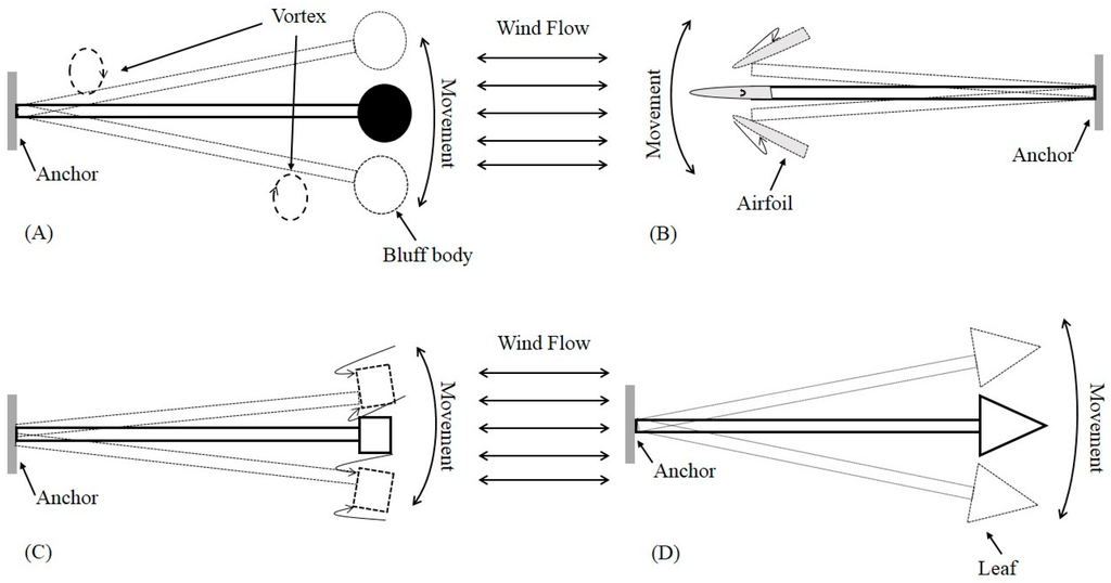 Common aeroelastic mechanisms for wind energy harvesting: (A) vortex shedding, (B) flutter, (C) galloping and (D) flapping leaf.