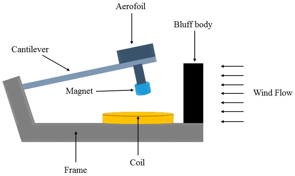 Zhu et al. [69] presented an electromagnetic wind energy harvester based on VIV. The proposed device includes a 50 mm × 18 mm × 0.2 mm cantilever made of Beryllium Copper (BeCu). As shown in Figure 11, a cylindrical magnet, which is made of NdFeB-38H with 15 mm diameter and 10 mm height, is fixed at the end of the cantilever with certain distance (15 mm) from an 80 mm × 25 mm × 6 mm rectangular aerofoil, which is located at the other side of the cantilever. The overall size of the device is 12 cm × 8 cm × 6.5 cm. According to reported experimental data, the proposed electromagnetic generator could operate with harvested electrical output power of 470 μW at the wind speed as low as 2.5 m/s. When the wind speed reached 5 m/s, the amount of output power was 1.6 mW. Although the harvested electrical power by the proposed device in this study is enough for most of low power electronic devices, using bluff body may somehow reduce level of portability. In addition, high cut-in wind speed (2.5 m/s) is another drawback of the proposed energy harvester.