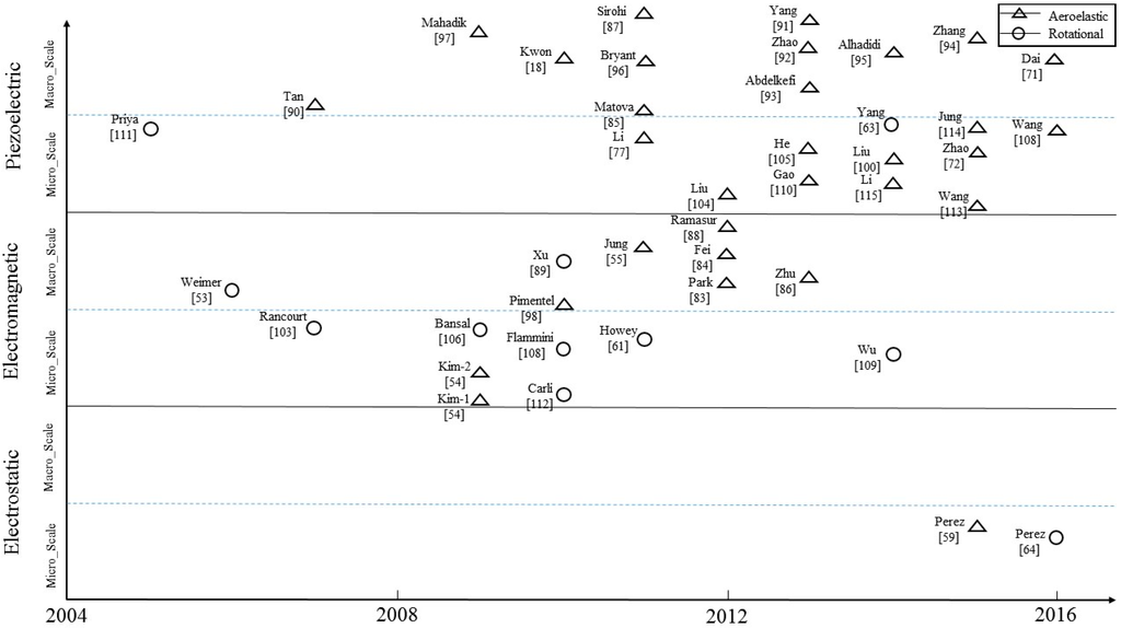 Another rotational piezoelectric wind energy harvester, which was introduced by Yang et al. [63], consisted of 12 micro-cantilevers with 47 × 20 × 0.5 mm3 dimension behind the fan. One or more than one shaft (ball) was located at the center of the fan. Wind flow could rotate the fan, while the interaction between shafts would apply relative stress to piezoelectric cantilevers. The prototyped device in this research could generate 613 μW rectified power. In comparison with the conventional energy harvesters such as wind turbines, the size of the developed devices in these studies was significantly reduced. In spite of the size reduction, how to prevent reducing the harvested power is a challenging question to be addressed.