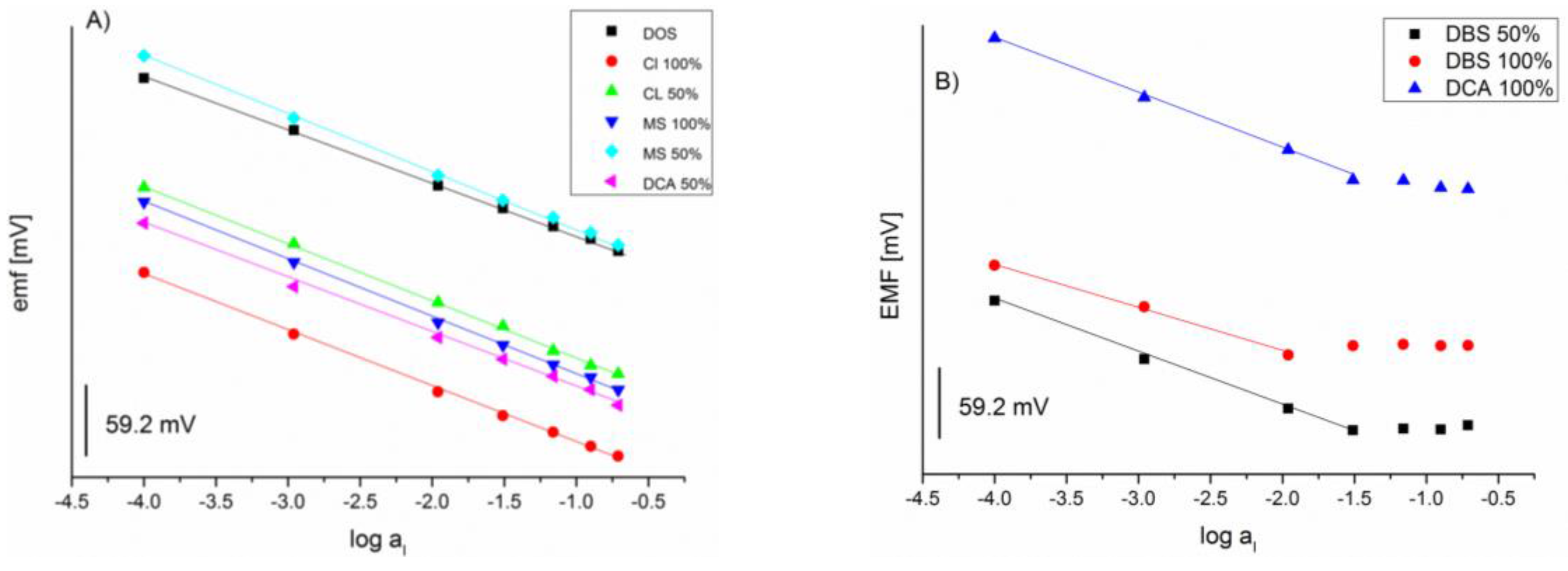 Potentiometric slopes recorded for ion-exchange membranes plasticized with selected RTIL. (A) responses of IL− based electrodes that do not show Donnan failure; (B) responses of electrodes based on [DCA−] and [DBS−] exhibiting Donnan failure.