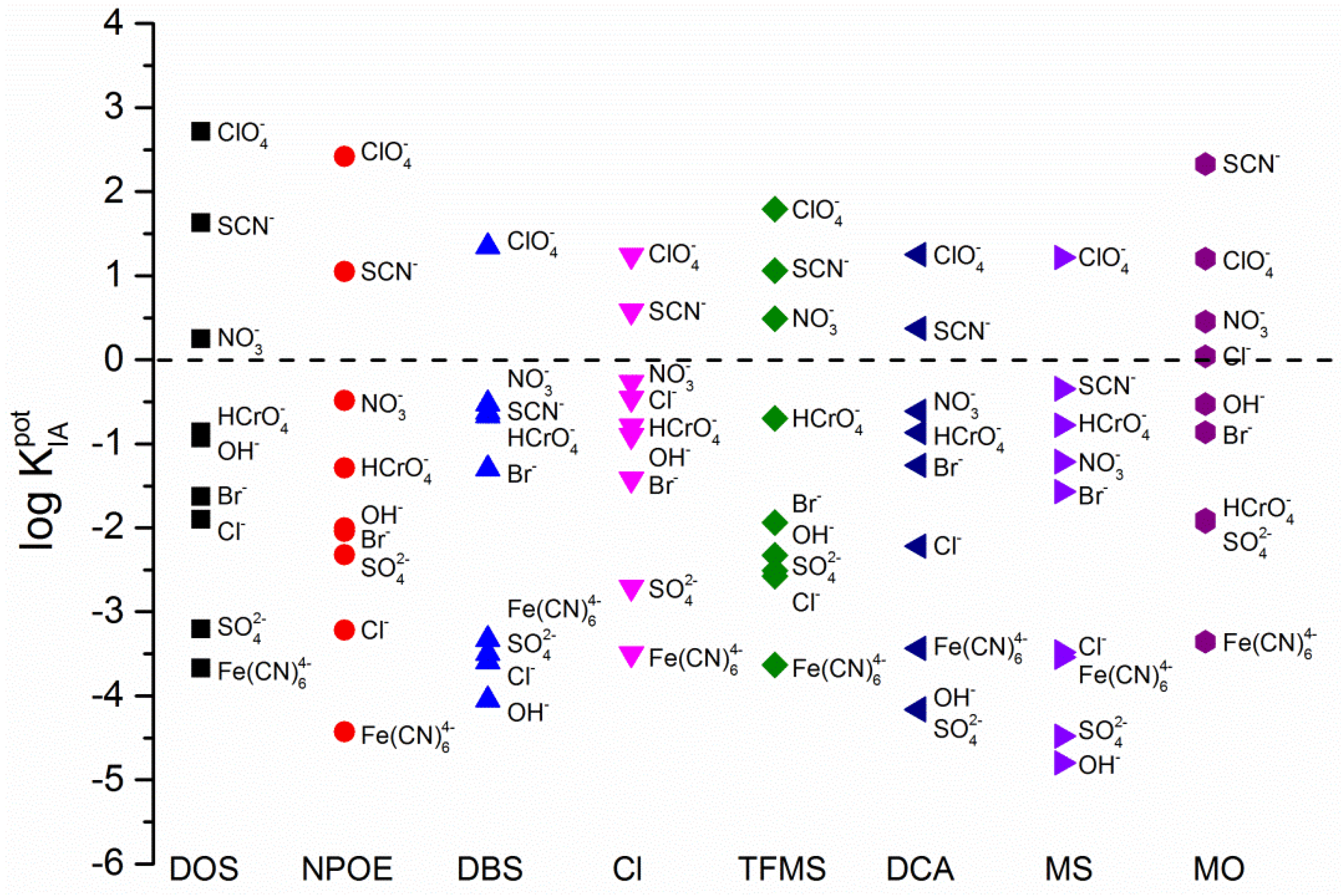 Table 3 summarizes all numerical values of selectivity coefficients while Figure 3 is its accompanying illustration. From Figure 3 it could be seen that some hydrophilic ions were preferentially extracted into the membrane bulk over the more lipophilic anions depending on the specific IL based membrane. For example, the extraction of chloride anions in [TFMS−] and [DBS−] based membranes appears to be less energetically favorable than the extraction of sulfate or bromide ions. Whereas, sensing membranes containing [MO−] moieties responded preferentially to the nitrate ions rather than ClO4− anions. Moreover, most of the ISEs favored extraction of nitrate ions over dichromate ions as predicted by the ion-exchange theory with the exception of membranes containing [MS−] species that showed more selective response towards dichromate ions.