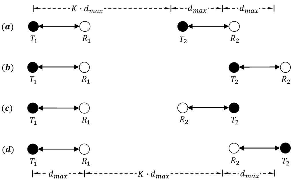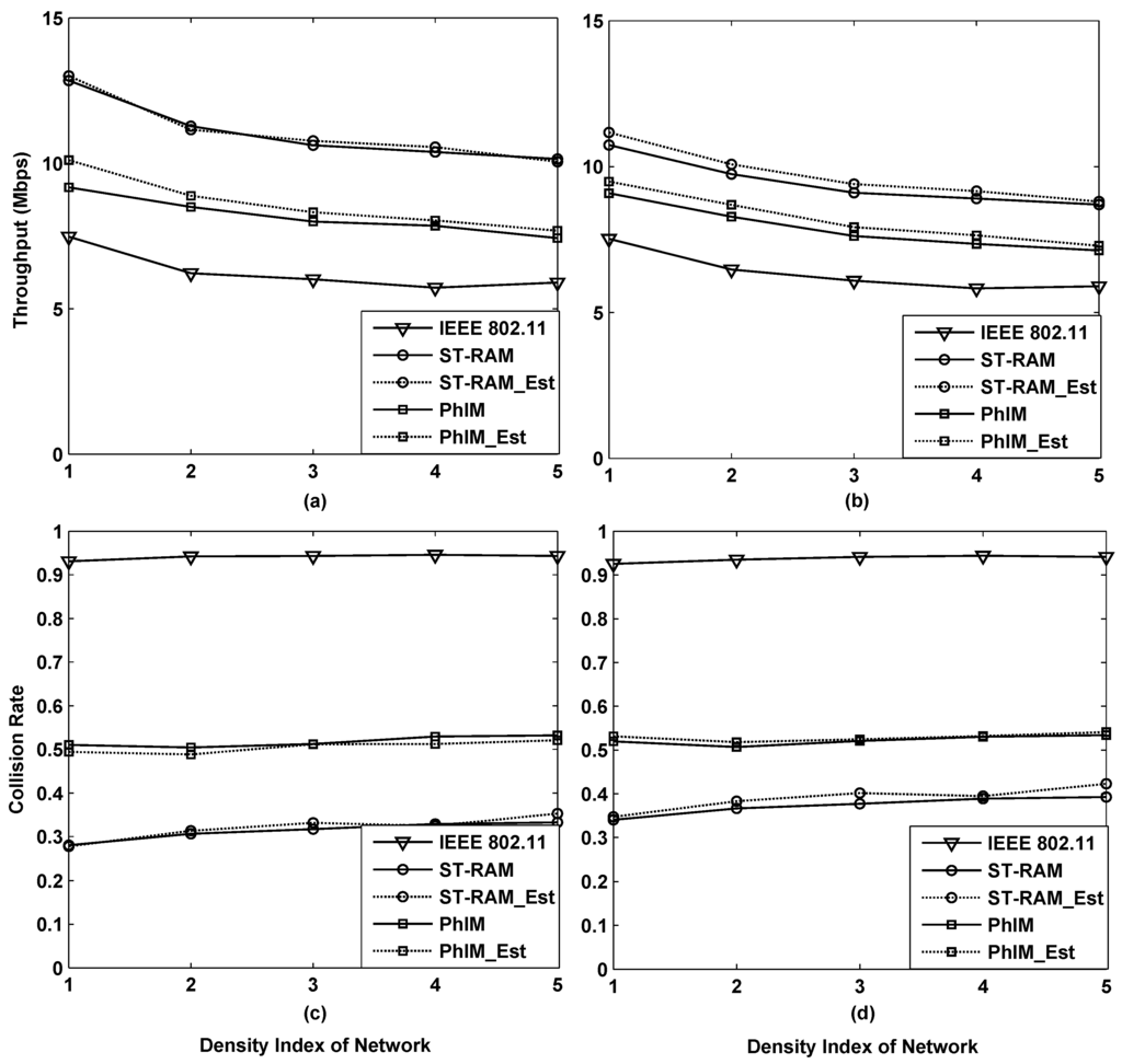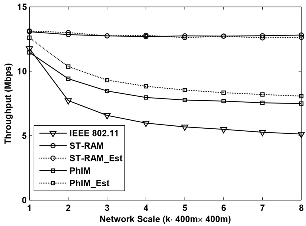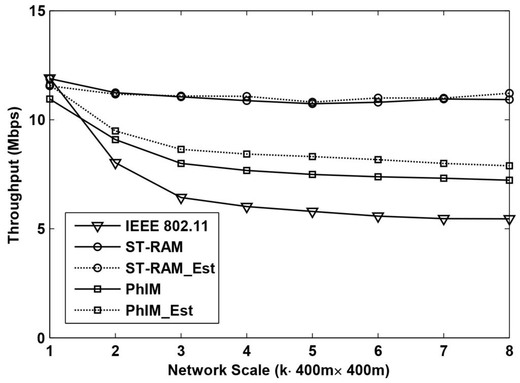 The throughput of “” is much higher than that of “”, because the interference from hidden nodes is significantly suppressed by setting large CSR. However, with the increase of the network scale, the throughput of “” can only reach a certain level. It is because a larger CSR not only suppresses the number of the hidden nodes but it also increases the number of the neighbor nodes. The number of the neighbors will increase as a function of the extension of the network coverage. A larger number of neighbor nodes with more serious channel contention will also decrease the throughput.