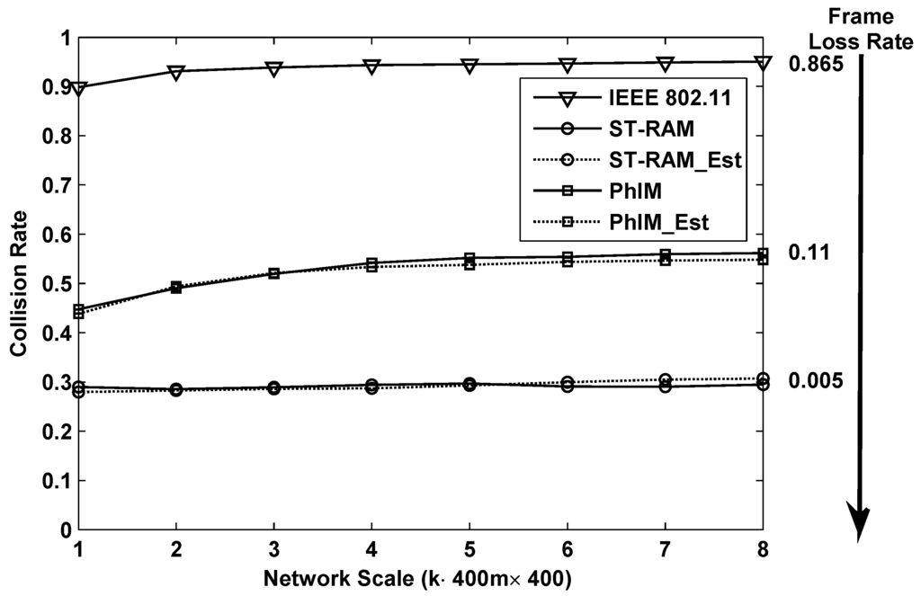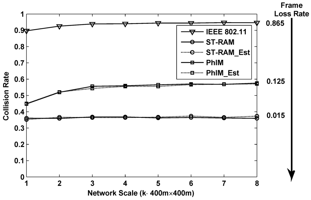 According to the IEEE 802.11 protocol, we set the maximum number of retransmissions as 4 and simulate the corresponding frame loss rate in networks with different scales. The approximate frame loss rates in large scale networks, where the frame loss rate becomes stable, are labeled on the right side of