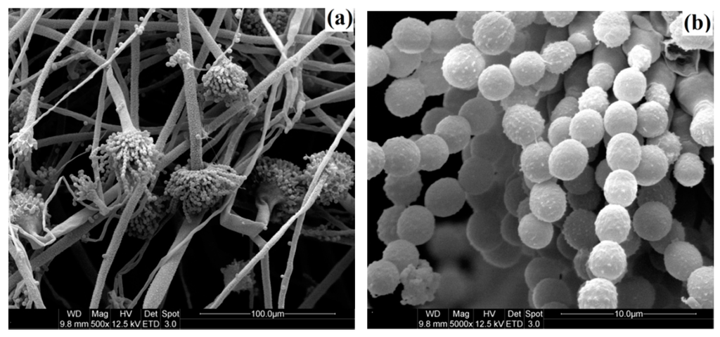 Fungi cells of A. flavus on the edge of inhibition zone and on the control plate were picked up with the sterile hole puncher for observation. First, the fungi cell samples were fixed with 2% (v/v) glutaraldehyde at 4 °C for 12–18 h. After washing three times with phosphate buffer saline (PBS), the cells were post-fixed with 1% (w/v) osmium tetroxide prepared with 0.1 M PBS and dehydrated in a graded ethanol series from 30%, 50%, 70%, and 95% to absolute ethanol. Then, the dehydrated cells were subjected to critical point drying with liquid CO2. After Pt sputtering, the samples were observed by SEM equipped with a LEO Gemini 1530 field emission at a voltage of 5 kV acceleration [3,43].