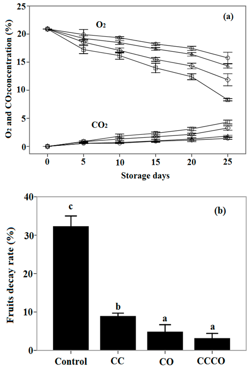 Chitosan-oil coating as a barrier of gas and a carrier of the antimicrobial agent could create an internal modified atmosphere in the package and control the decay of fruits during the storage period [18]. The changes in the concentration of O2 and CO2 in the packages of sweet cherry fruits with different treatments were analyzed with gas sensors. As can be seen in Figure 9a, the O2 concentrations in the package for the samples treated by the chitosan coating with cinnamon oil and the chitosan coating are 15.76% and 14.32% after 25 days of storage, respectively. The O2 concentration inside the packages of control fruits was reduced significantly, and was only 8.3% for the control samples. On the other hand, the CO2 concentration in the packages for the treatments of chitosan-oil coating and control are 4.33% and 1.43%, respectively. The production of CO2 in the package for the chitosan-oil treatment are lower compared to that of fruits coated with only chitosan or only oil treatment. Moreover, during the storage time, the cheery fruits could be infected by molds bringing the fruits from the field, which could be strongly delayed by the treatment of chitosan-oil coating. As the results in Figure 9b show, the higher decay (32.37%) rate of uncoated cheery fruits is observed at the end of storage. However, cherry fruits coated with the chitosan-oil composite film display the lowest decay rate throughout the 25-day storage period, at 3.13%, which is much lower than that of control fruits. The decay rate of fruits treated by cinnamon oil is 4.83% after 25-day storage. The PPO activity of fruits treated with different coatings is shown in Figure 9c; the lowest activity of PPO was observed in the fruits treated with the chitosan-oil coating, which was 170.7 U/g on the 25th day of storage. However, the control fruits exhibited the highest activity for all of the storages. PPO activity is 210.0 U/g at the end of storage. It could be inhibited by the chitosan-oil coating during the storage period. Furthermore, as can be seen in Figure 9c, differences in PPO activity were observed among different storage days for 5 to 25 days of both treatments of only oil treatments and the chitosan-oil coating. Differences in the PPO activity of fruits were also found among the different treatment at the same storage days, from 5 to 25 days. The coating of chitosan with cinnamon oil could be used in maintaining the quality of cherry fruits.