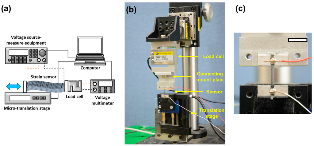 Therefore, in this research, we have designed an integrated evaluation system to measure changes in stress and conductance simultaneously under applied strain conditions. The evaluation system was controlled through a LabVIEW program that acquires information on applied strain, stress, and electrical resistance of the sensor simultaneously at desired rate. To evaluate the system, we fabricated a simple stretchable sensor comprising a thin metal layer and an elastomer substrate. By measuring stress and change of resistance across the strain sensor, we have successfully confirmed the sensor’s performance. We expect that the integrated evaluation system could be a useful tool for determining the material and electrical characteristics of conductive and stretchable strain sensors.