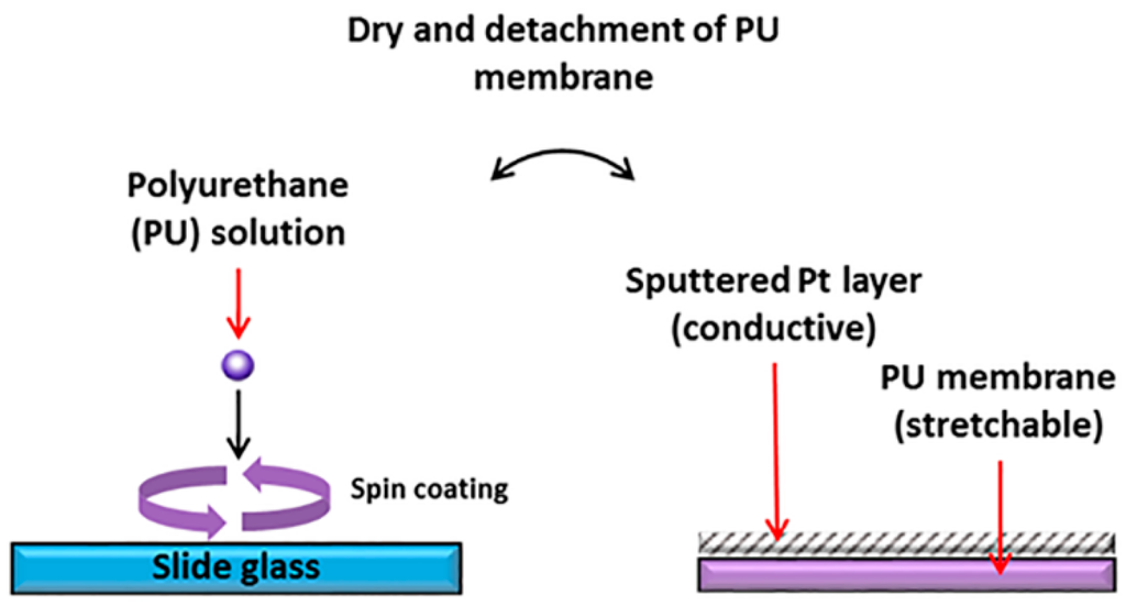 To validate the integrated evaluation system, we fabricated a simple strain sensor consisting of a conductive metal layer and stretchable membrane, as shown in Figure 2. First, a thermoplastic polyurethane (PU) (Pellethane 2363-80AE, Lubrizol, Wickliffe, OH, USA) was dissolved in a 13 wt% mixture of tetrahydrofuran (THF) and dimethylformamide (DMF, 60/40, v/v).