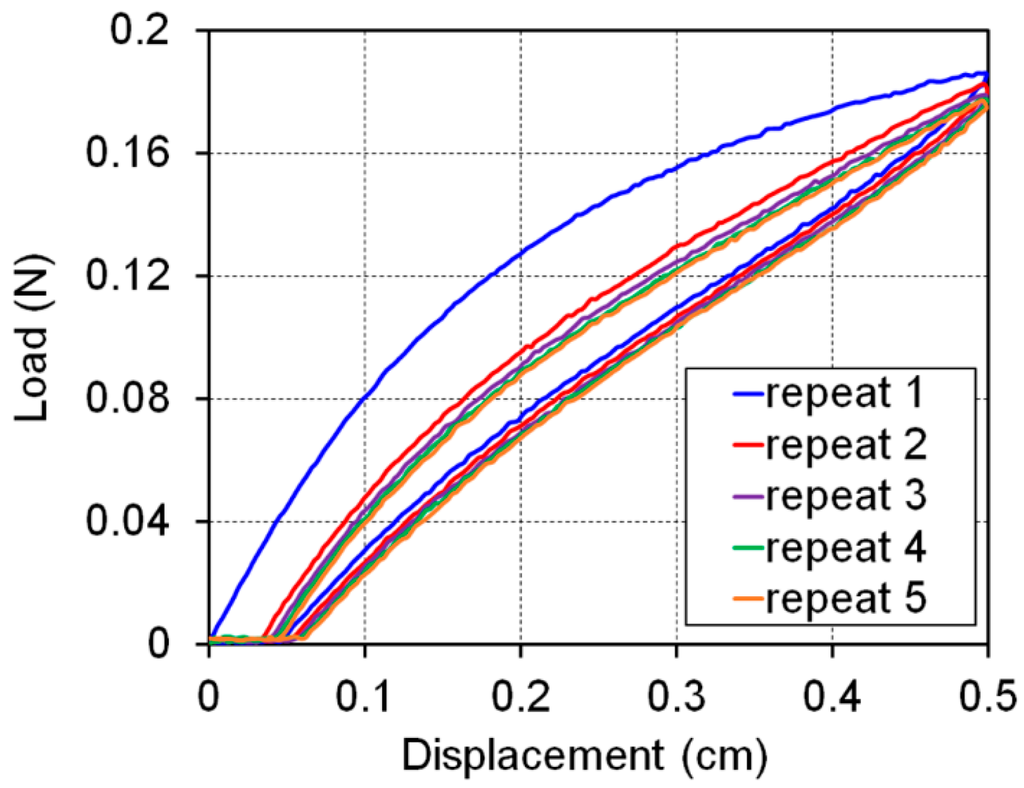 The membrane did not recover to the initial length, as shown in Figure 3, indicating plastic deformation (about 10%). During the second test, the stress was considered to be zero until the applied strain was over 10%. This means that no force was experienced by the membrane at strains under 10% because of the plastic deformation. In fact, as the number of repetitions increased, the stress curve indicated saturated stress behavior because the plastic deformation also reached a saturated state. The plastic deformation behavior and the saturation stress curve are in accordance with the general characteristics of elastomers such as PU. The integrated experimental setup was able to measure the load applied to the strain sensor with a very high resolution (~6 mN). This highly sensitive evaluation system can be used to measure very small forces applied to materials with low mechanical strength. The evaluation of the hysterical behavior will be revisited in the next section.