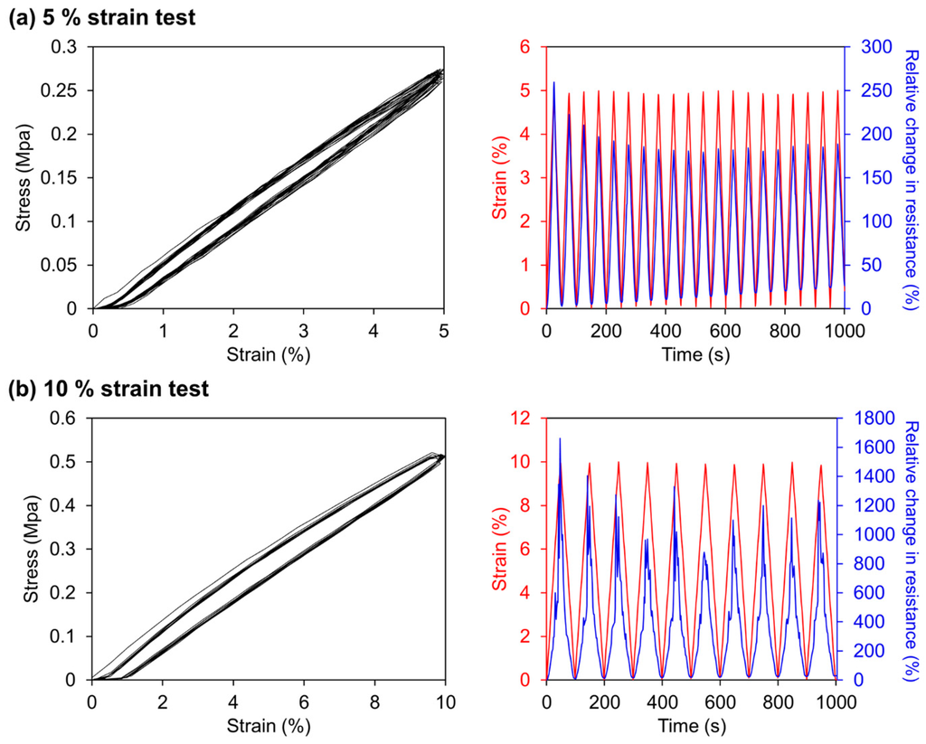 In the stress-strain curves for both strain tests in Figure 4, there exists an apparent strain hysteresis which is caused by the plastic deformation of the membrane. As the strain cycle continued, the hysteresis was saturated up until one tenth of the maximum strain applied during the cycles, namely 0.5% for 5% strain test and 1% for 10% strain test. The right graph of Figure 4a shows repetitive tests of both strains and the accordingly acquired relative change in resistance. As the sensor went through the strain cycles, the lower peaks of relative change in resistance gradually grew from zero. This is the result of the plastic deformation that prevents the sensor to return to its original electrical resistance.