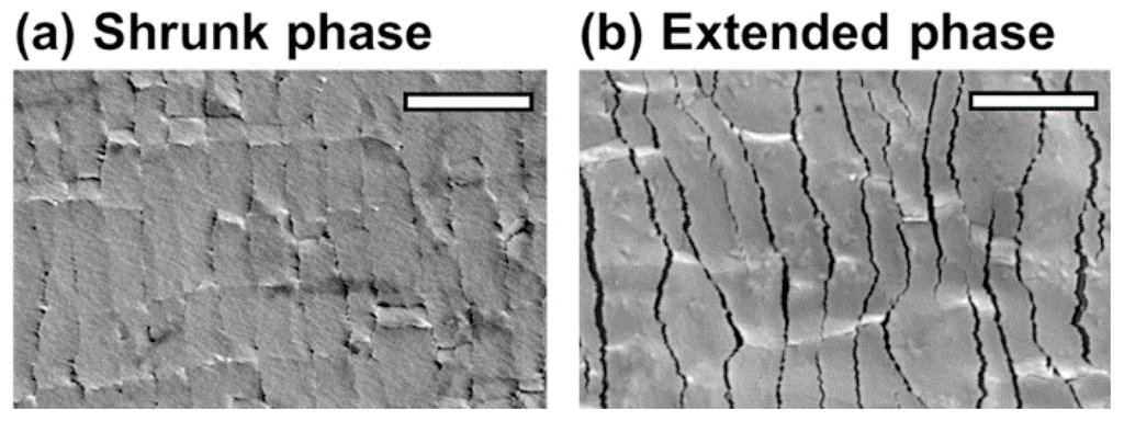 High-resolution scanning electron microscopy image of the cracks in the platinum (Pt) layer during (a) shrunk phase and (b) extended phase (5% strain) (Scale bar: 3 μm).