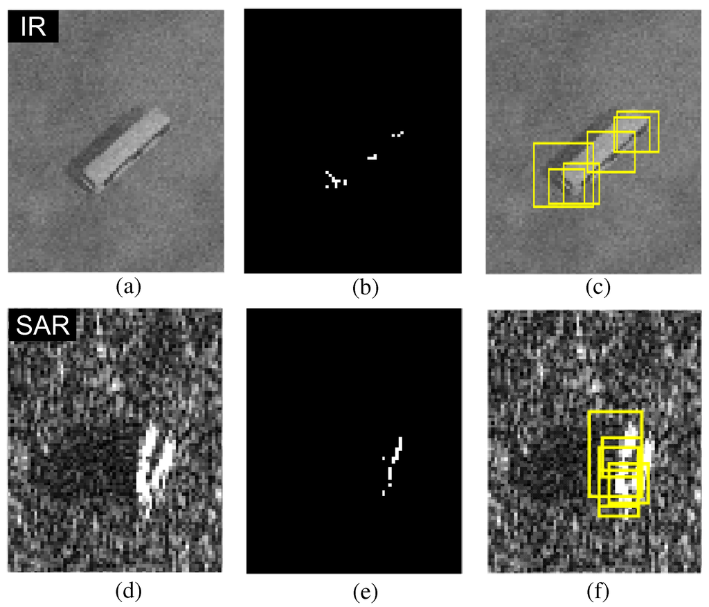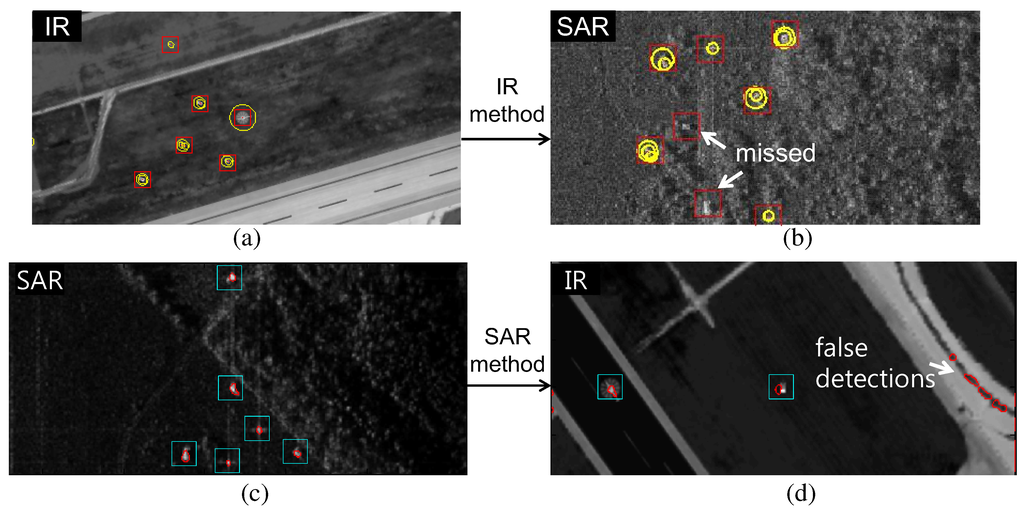 In general, sensor-dependent, specific target detection algorithms show good target detection performance. That is, the SAR sensor requires a proper scatter noise reduction method and the IR sensor requires proper modeling of the thermal targets. Sensor fusion using sensor dependent algorithms can show the best target detection performance. On the other hand, it is more efficient to use a single algorithm for SAR- and IR-fusion based target detection. A single algorithm can provide cost-effective hardware implementation for real-time applications using a system on a chip (SOC), field programmable gate array (FPGA), or general purpose graphics processing unit (GP-GPU). Reduced tuning parameters can allow faster system optimization in outdoor environments. Finally, a single algorithm is easy to manage for debugging and updating purposes. Although a unified algorithm is ideally suitable, actual applications have shown disappointing results, as illustrated in Figure 2. A Scale Invariant target detector shows good performance in IR small target detection, as shown in Figure 2a [22]. If the method is applied to a SAR image, it misses several important targets, as shown in Figure 2b. An Active Contour-based method shows excellent performance in SAR target detection Figure 2c [33]. If the method is applied to an IR target detection problem, it produces disappointing results, as shown in Figure 2d. Therefore, it is difficult to find a single method that is suitable for both SAR and IR target detection.