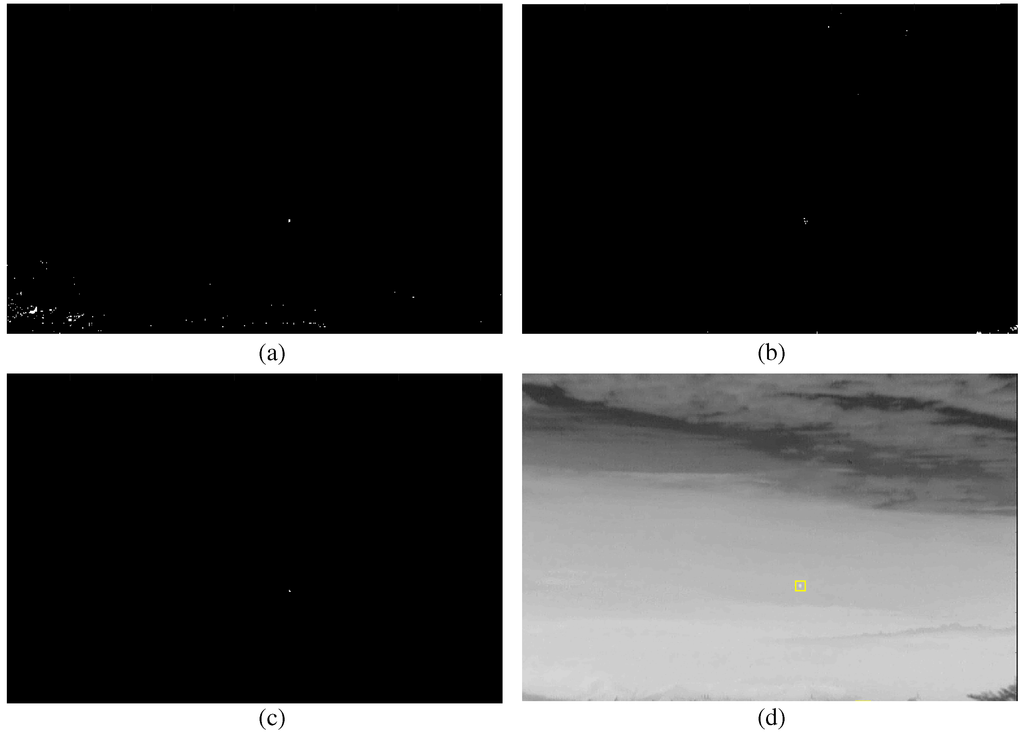 Successful small infrared target detection results: (a) fused intensity map; (b) fused orientation map; (c) enhanced map; (d) final detection.