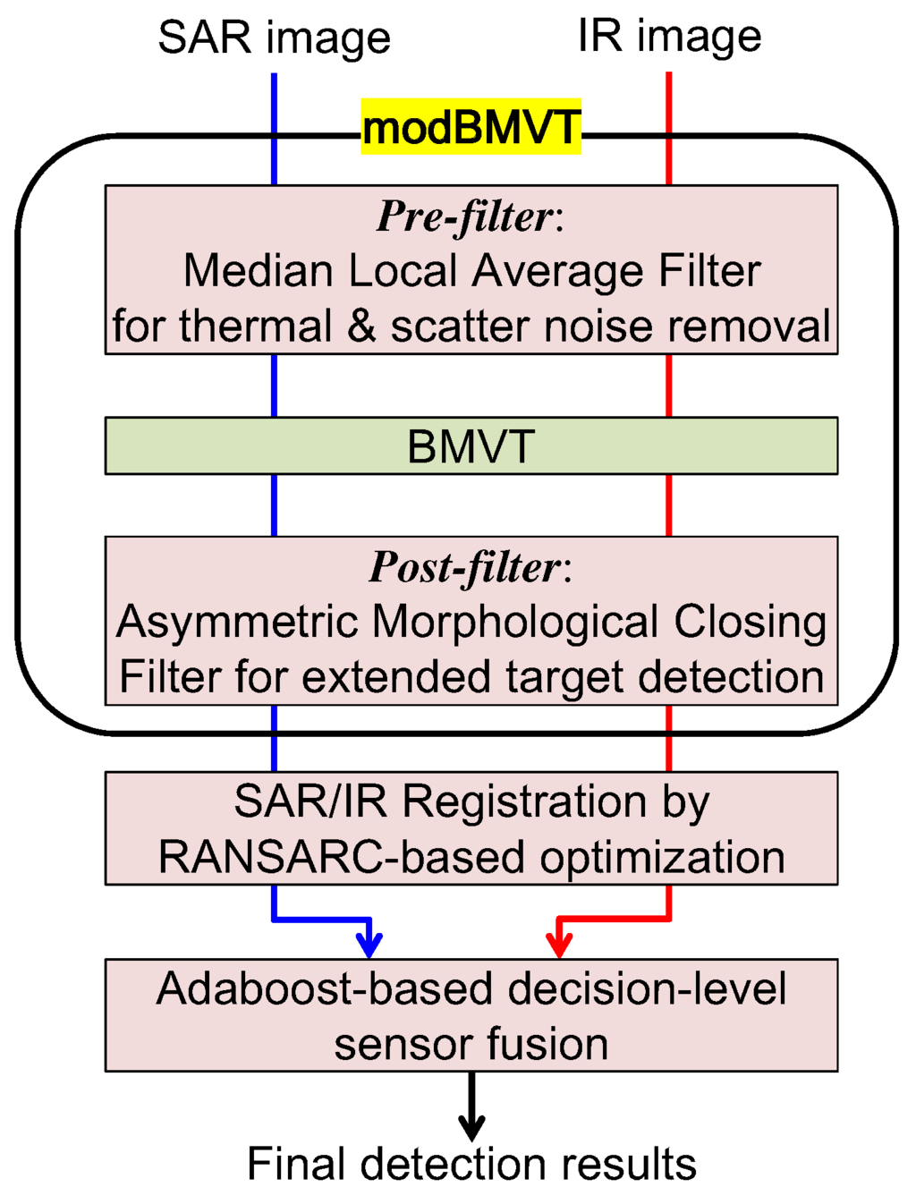 Based on these motivations, this paper proposes a single detection method to detect both SAR and IR targets simultaneously for a SAR and IR fusion study. In this study, a Boolean Map Visual Theory (BMVT)-based target detector was used as the baseline method [23]. Although the BMVT is effective for small IR target detection, it shows weak performance on extended IR and SAR targets. The original method was modified by inserting a median local average filter and an asymmetric morphological closing filter (called modBMVT) to handle the simultaneous SAR and IR target detection problem. Another contribution is the use of automatic SAR and IR image registration by RANdom SAmple Region Consensus (RANSARC) optimization on the detected target regions. The final contribution is the demonstration of target detection by Adaboost-based SAR and IR fusion. The proposed sensor fusion strategy should be assessed for target detection, even though deep learning algorithms are advanced techniques and have been provided to outperform in CCD-based pedestrian detection [34,35]. The deep learning algorithms require huge training images and are optimized for classification not detection or sensor fusion problems. Therefore, the proposed sensor fusion strategy should be assessed to improve the target detection performance.