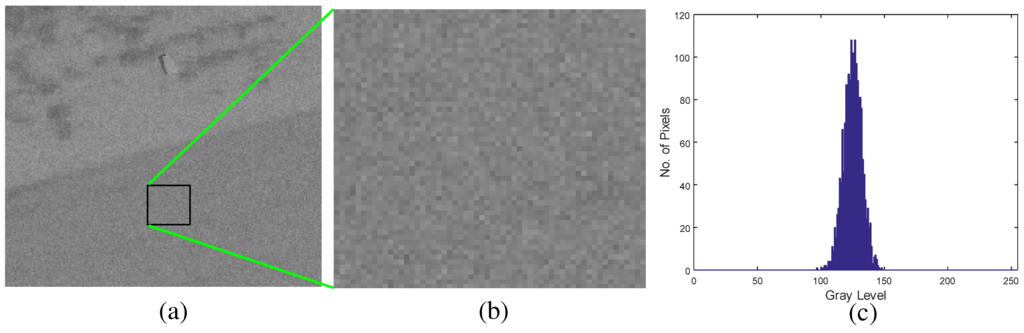 Thermal noise analysis in an infrared image: (a) test sample image; (b) enlarged image of background region; (c) noise distribution.