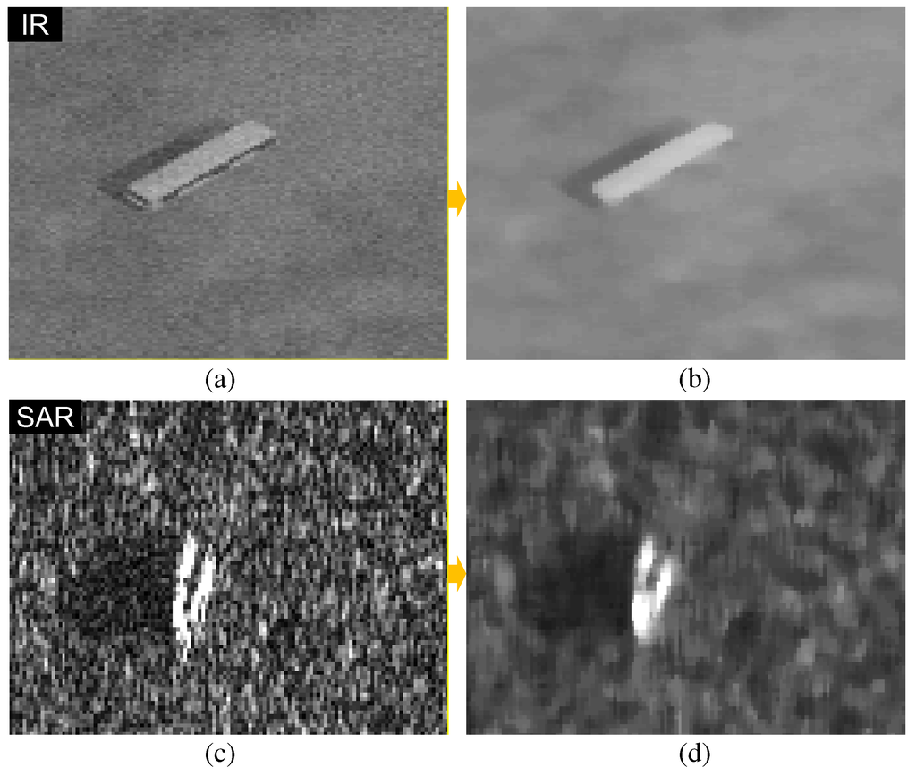 Proposed MLAF-based thermal and scattering noise reduction results: (a) noisy IR image; (b) MLAF-based noise reduction; (c) noisy SAR image; (d) MLAF-based noise reduction.