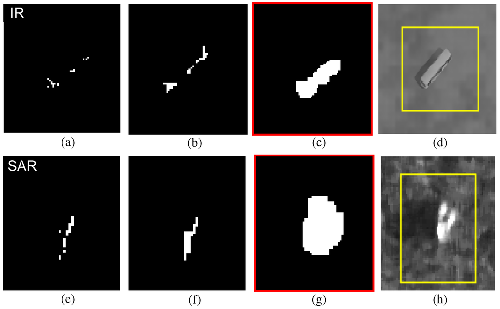 Asymmetric morphological closing filter (AMCF)-based IR/SAR target detection results: (a) initial IR target detection in BMVT; (b) conventional symmetric morphological closing filter (IR, ); (c) proposed asymmetric morphological closing filter (IR, ); (d) detected IR target; (e) initial SAR target detection in BMVT; (f) conventional symmetric morphological closing filter (SAR, ); (g) proposed asymmetric morphological closing filter (SAR, ; (h) detected SAR target.