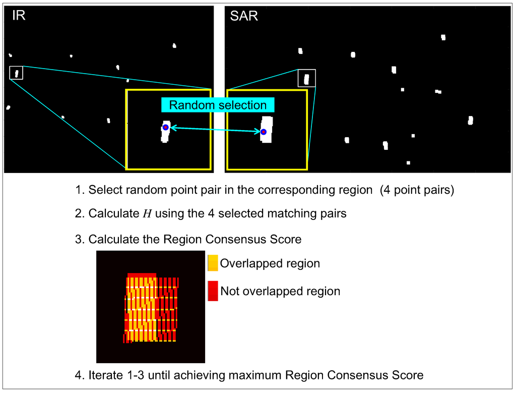 The next step is to calculate the image homogrphy for each matching combination [41]. The final step is to select the best homography that maximizes the matching consensus of the remaining matching points, such as the RANSAC method [43]. The estimated initial homography () is inaccurate because the target center points detected are affected by the image noise and detecting environments. This paper proposes a novel homography optimization method by applying RANdom SAmple Region Consensus (RANSARC) optimization to the detected SAR/IR regions, as shown in Figure 14. Given the SAR and IR matching information and detected regions (), 4 random matched points were selected from the corresponding matched regions. The next step was to calculate the hypothesized homography and region consensus score using Equation (9), where denotes the transformed SAR region using the hypothesized homography.