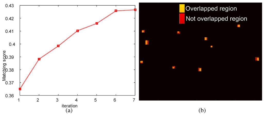 RANSARC-based homography optimization results: (a) matching score graph; (b) region overlap image using the optimized homography ().