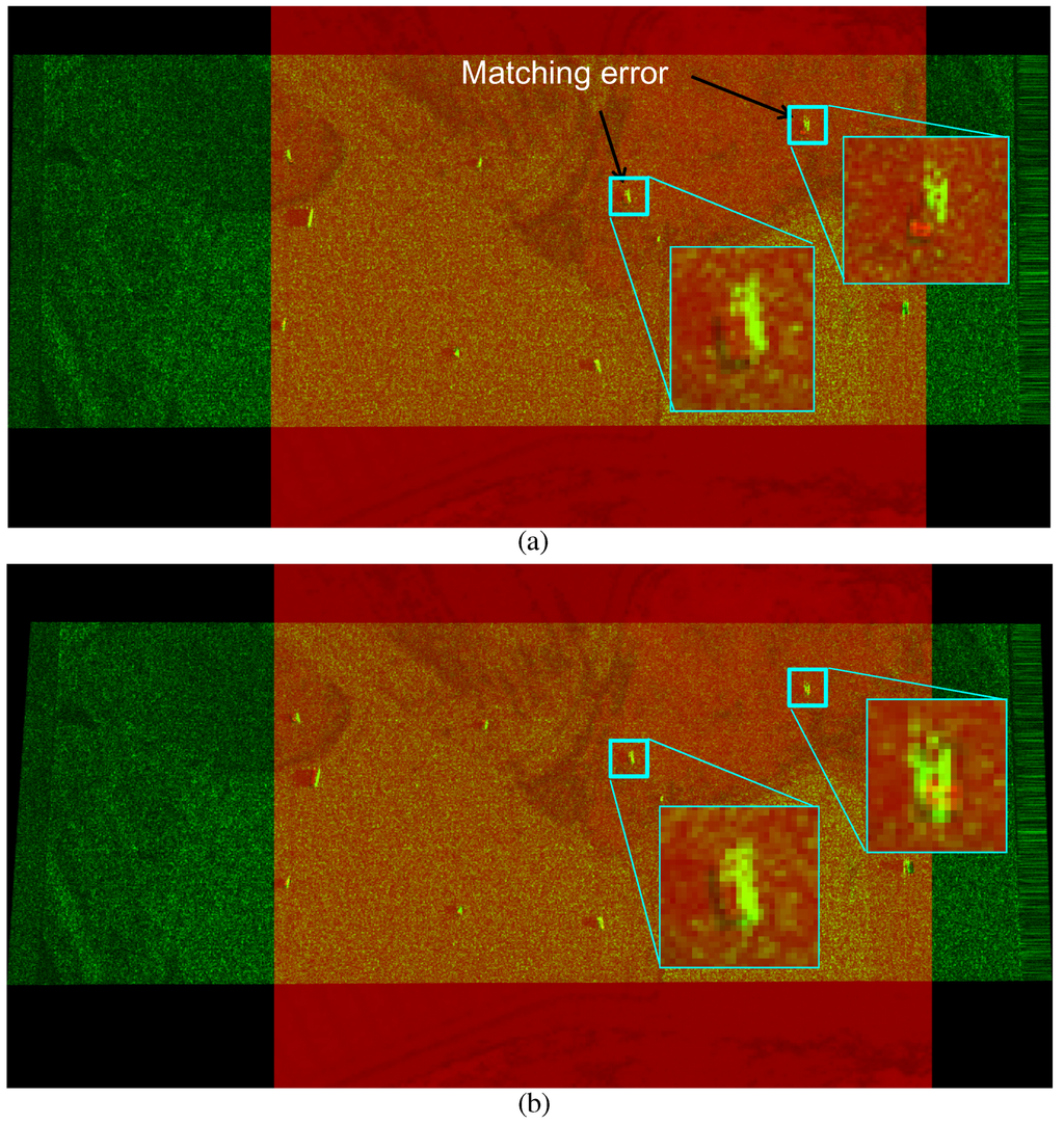 This process continues until the maximum score is achieved. Figure 15 presents the region score optimization results and final region overlap image using the optimized homography. The yellow dots represent the region overlap between the IR and SAR image. Figure 16 compares the image registrations conducted by the initial homography () and optimized homography () estimated by RANSARC. The SAR image is represented as the green channel and the IR image is represented as the red channel. Note that the two targets indicated by the arrows were misaligned using the initial homography, as shown in Figure 16a. The proposed RANSARC can reduce these errors, as shown in Figure 16b.