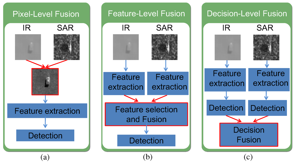 SAR and IR sensor fusion-based target detection schemes: (a) pixel-level fusion; (b) feature-level fusion; (c) decision-level fusion.