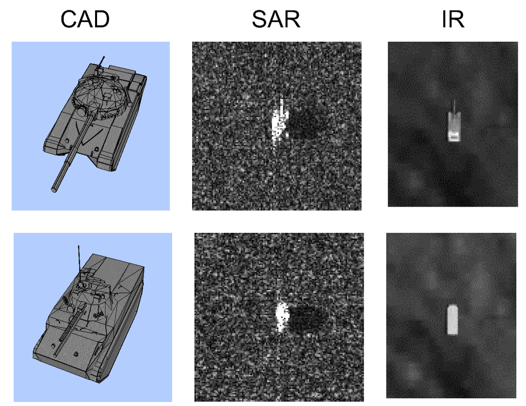 Automatic target detection (ATD) is very important in military applications and there are challenging problems with ground surveillance [1]. Many studies have attempted to achieve high detection rates and low false alarm rates for well-known challenges, such as the target type, weather conditions, and background clutter [2,3,4]. On the other hand, the target detection problem is more difficult if the surveillance area cannot be accessed directly. Figure 1 shows a scenario of target detection in an inaccessible area using a multitude of sensor types, such as infrared (IR) and synthetic aperture radar (SAR), to enhance the detection performance. A SAR sensor mounted on an airplane can image an inaccessible area by the small depression angle and the IR sensor mounted on a satellite or unmanned aerial vehicle (UAV) can image the same region in a top-down view.