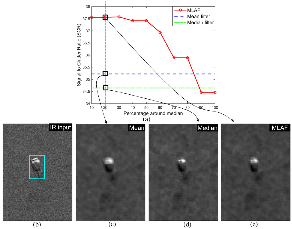IR noise removal comparison: (a) signal-to-clutter ratio by varying the percentage around the median value in MLAF; (b) IR test image; (c) mean filter result (); (d) median filter result; (e) proposed MLAF result at 20% around the median.