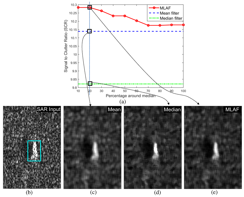 SAR noise removal comparison: (a) signal-to-clutter ratio by varying the percentage around the median value in MLAF; (b) IR test image; (c) mean filter result (); (d) median filter result; (e) proposed MLAF result at 20% around the median.