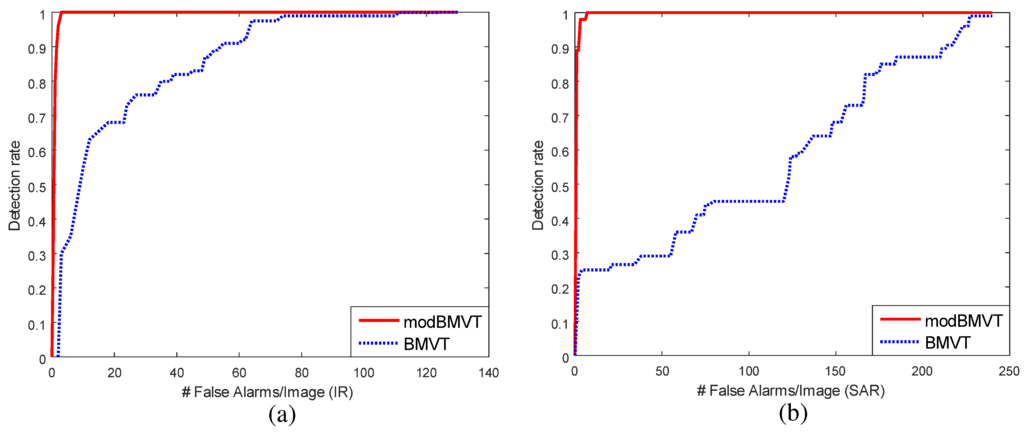 Performance evaluation of the individual target detection of the proposed modBMVT compared to the original BMVT: (a) ROC comparison for the IR test image of BG1-T10-IR; (b) ROC comparison for the SAR test image of BG1-T10-SAR.