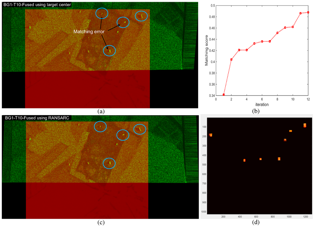 SAR and IR registration results for the background ID3 using BG3-T10-IR/SAR images: (a) initial automatic registration using a brute-force search from the detected target centers; (b) registration optimization curve of the proposed RANSARC; (c) refined registration results; (d) detected region overlap by the estimated homography.