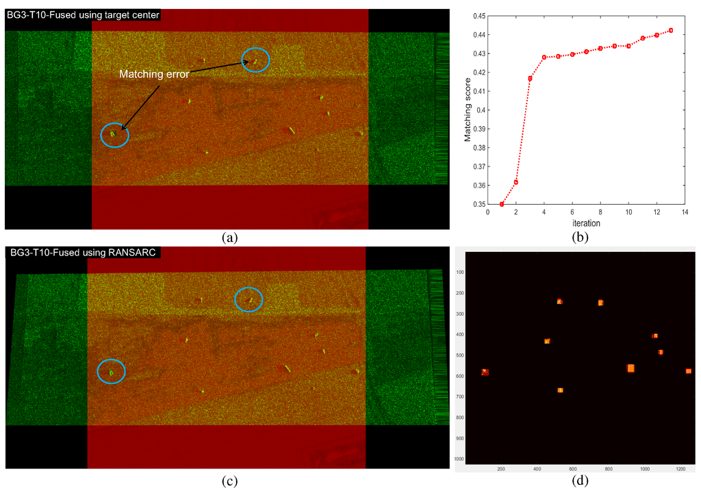 SAR and IR registration results for the background ID1 using BG1-T10-IR/SAR images: (a) initial automatic registration using a brute-force search from the detected target centers; (b) registration optimization curve of the proposed RANSARC; (c) refined registration results; (d) detected region overlap by the estimated homography.