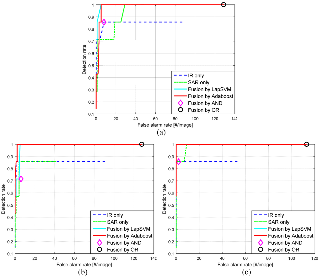 Table 1 lists the overall target detection performance for the different fusion schemes. As performance metrics, the detection rate and false alarms per image were used for this purpose. IR only (without fusion) produced a relatively low detection rate with a high rate of false alarms. SAR only produced a relatively high detection rate (96.9%) with high false alarms. The proposed feature-selection-based fusion method (Adaboost) showed the best detection rate (100%) with the lowest number of false alarms (4.1 false alarms/image). The next best was LapSVM-based fusion method. Note that Adaboost and LapSVM used a default decision making method (no bias is controlled). The simple logical AND fusion method showed the lowest detection rate with a relatively low number of false alarms. Although the logical OR method produced a perfect detection rate, it showed the highest number of false alarms.
