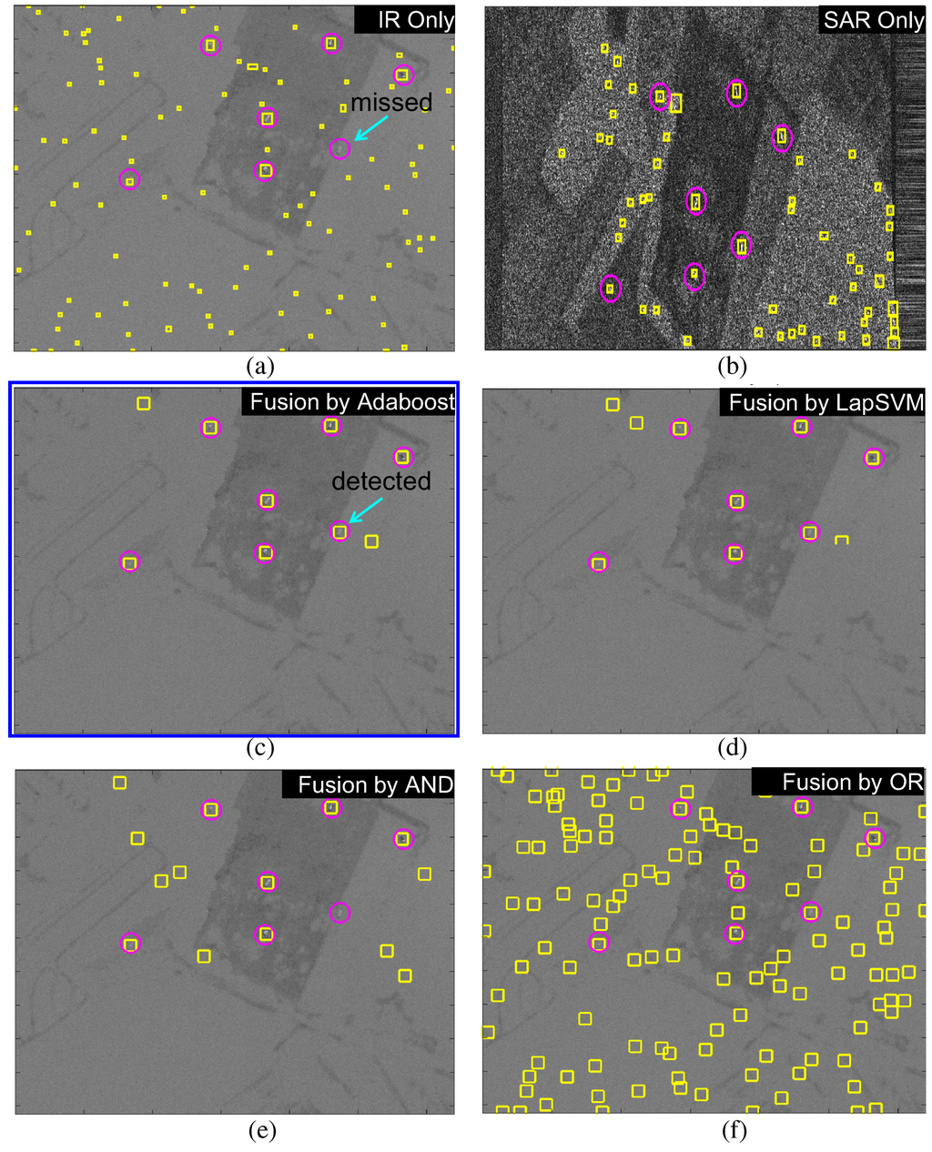 Comparison of target detection on the BG2-T7-IR/SAR DB: (a) without fusion (IR only); (b) without fusion (SAR only); (c) proposed Adaboost-based fusion; (d) LapSVM-based fusion; (e) logical AND fusion; and (f) logical OR fusion.