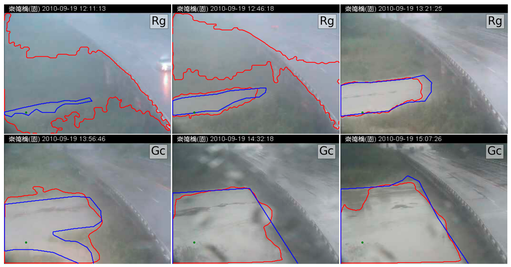 In this case study, two region-based segmentation algorithms were employed to identify flood regions. Historical outdoor images were recorded during a typhoon-induced rainstorm that occurred in September 2010 in Taiwan. The capture period was between 12:00 p.m. and 5:50 p.m., 19 September 2010. The outdoor imaging system replayed real-time videos streamed to Internet applications. For our evaluation, we extracted one image each minute, for a total of 350 images in the test image set. The video stream was decomposed to a spatial resolution of 352 × 288 in JPEG format. Part of the test image set is shown as thumbnails in Figure 5. The images were captured between noon (when the raining began) and nightfall (at the flood tide).
