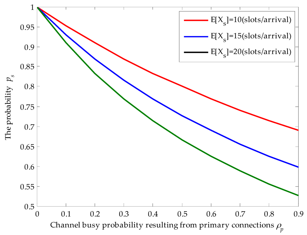 Effects of the channel busy probability resulting from primary connections and the average service time of secondary connections on the probability , where (slots/arrival), (arrivals/slot), (arrivals/slot) and .