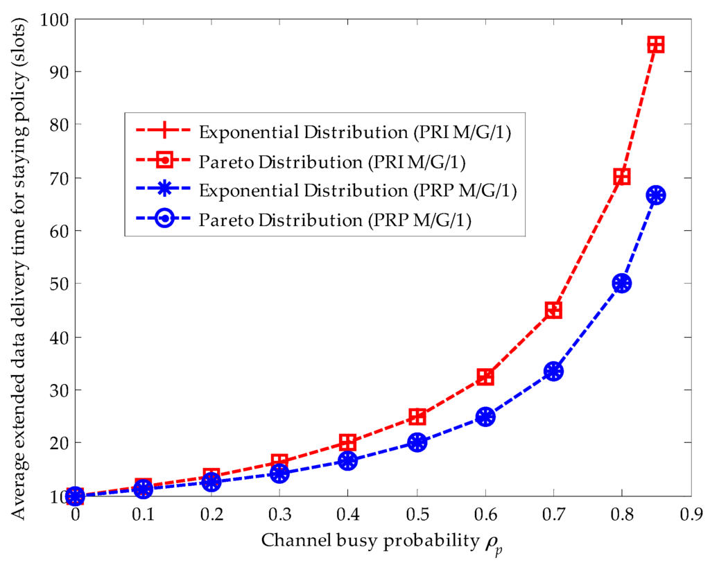Figure 4 compares the effects of the upper-truncated Pareto distribution and the exponential distribution for primary connections in the PRI M/G/1 and the PRP M/G/1 analytical frameworks when the staying policy is adopted. Firstly, we can see that the extended data delivery times in both analytical frameworks are the same. Because the extended data delivery time in the staying policy in Equation (22) is determined by the average service time of primary connections and the average service times are the same for the upper-truncated Pareto distribution and the exponential distribution, i.e., . Secondly, in the PRI M/G/1 analytical framework, the extended data delivery time is longer than that in the PRP M/G/1 analytical framework for the reason that the SU has to repeat its data transmission when an interruption happens in the PRI M/G/1 queuing network model. In other words, in the PRI M/G/1 queuing network model, the effective service time is lost in the repeat scheduling discipline. Moreover, with the increase of the channel busy probability, the difference value of the average service time in these two analytical frameworks becomes larger for the reason that a larger channel busy probability will result in more interruptions. For example, when , the difference value equals to 1.25 slots. When , the difference value equals to 7.5 slots.